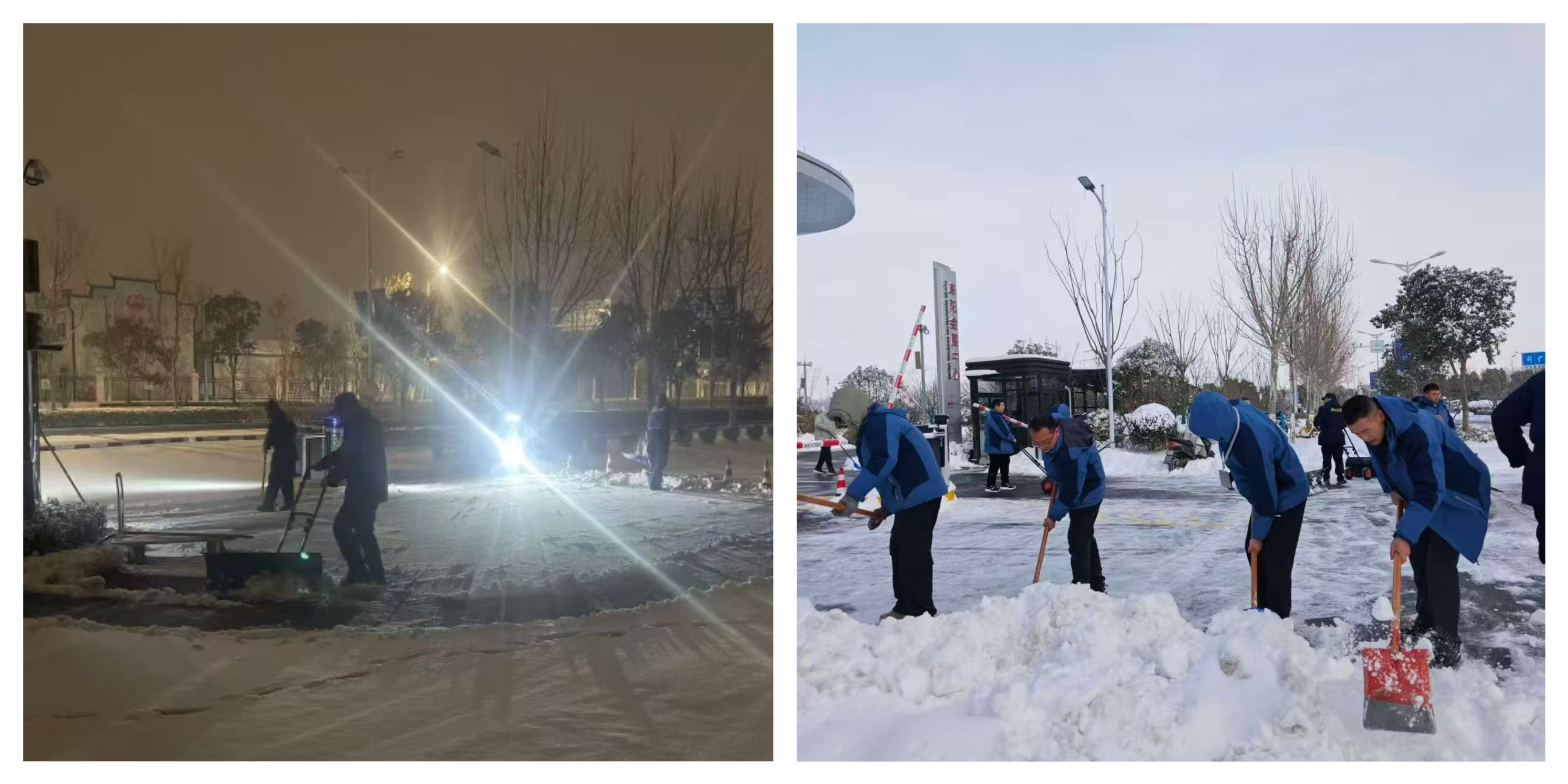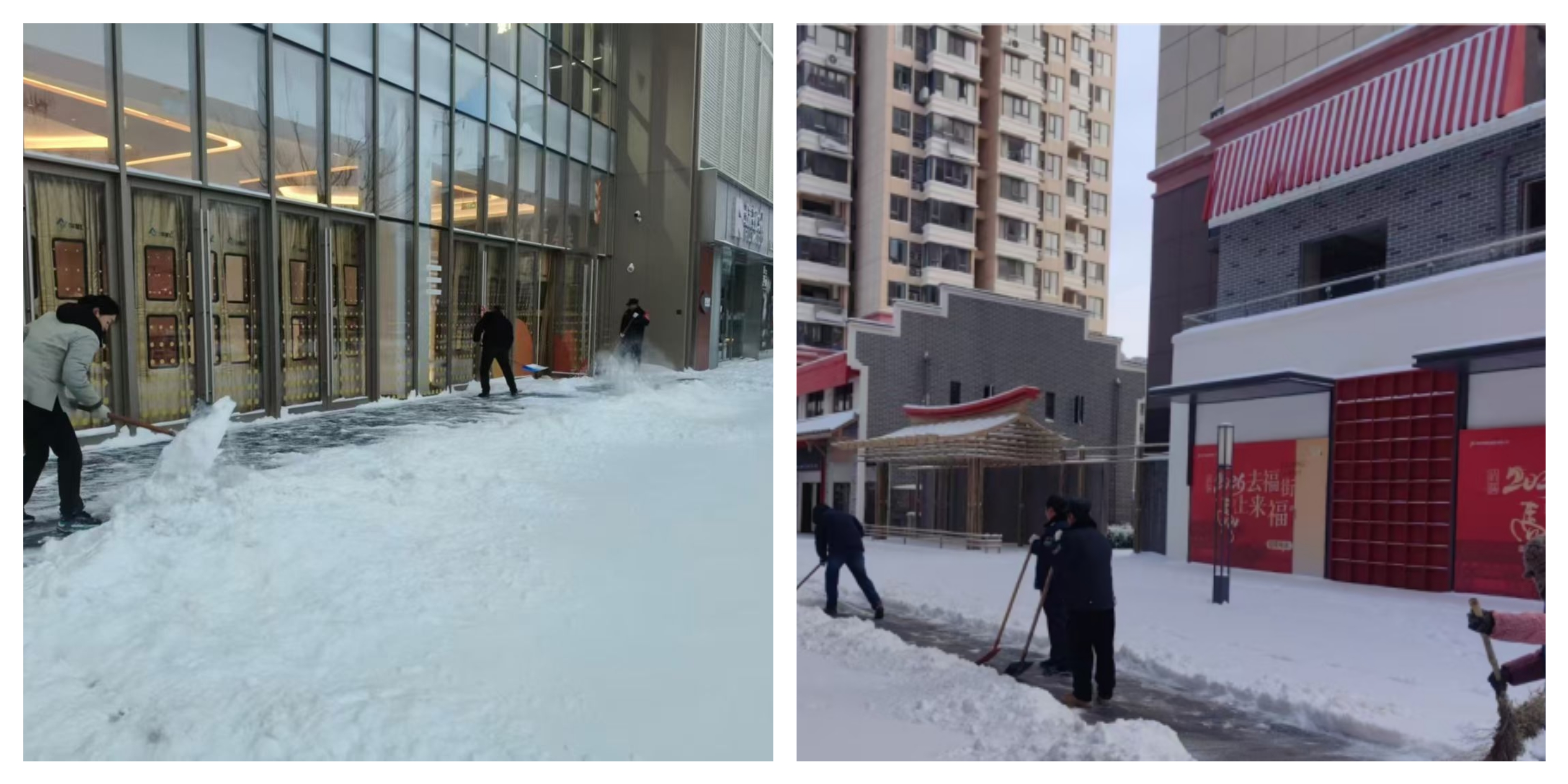 1月19晚降雪逐漸增大,各項目、鄰里匯商業(yè)、售樓部、會展中心分別組織專人在主干道、通道出入口清理積雪,潑灑工業(yè)鹽、融雪劑,對設(shè)備設(shè)施進行檢查,并設(shè)置24小時值班電話,應(yīng)對突發(fā)情況。